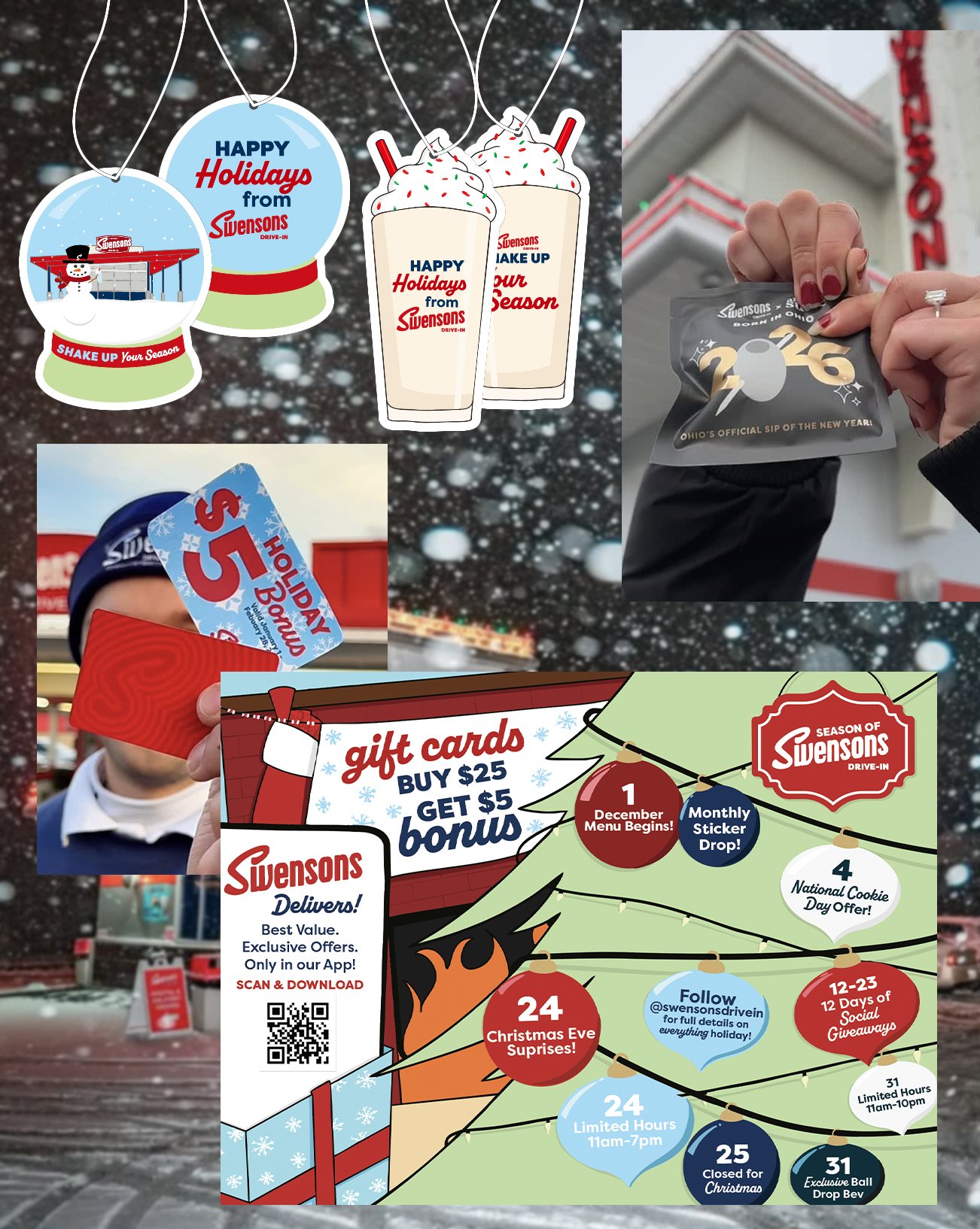 Items include tray mats, bonus cards, custom glitter bomb packaging, and branded air fresheners used as a Christmas Eve giveaway.